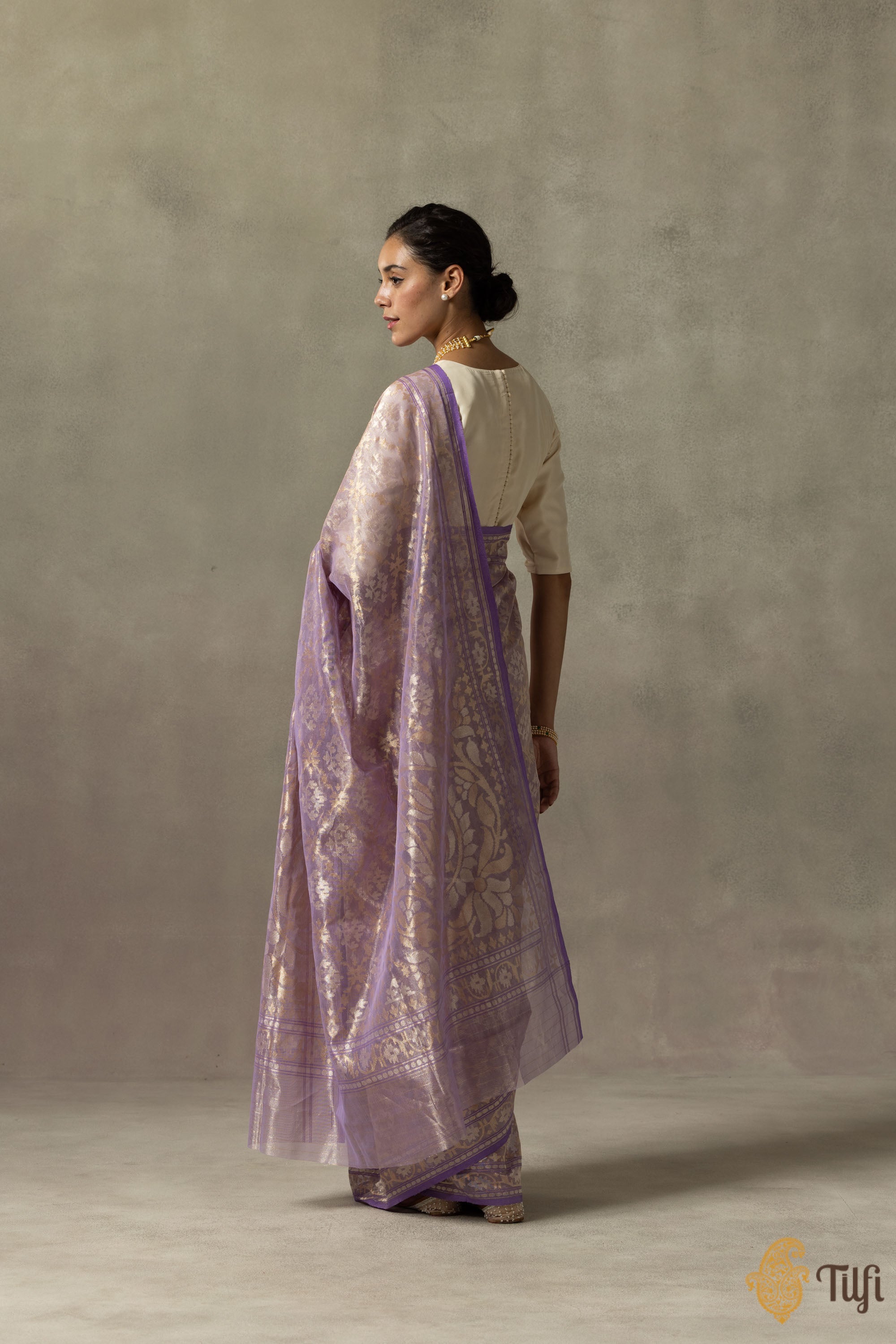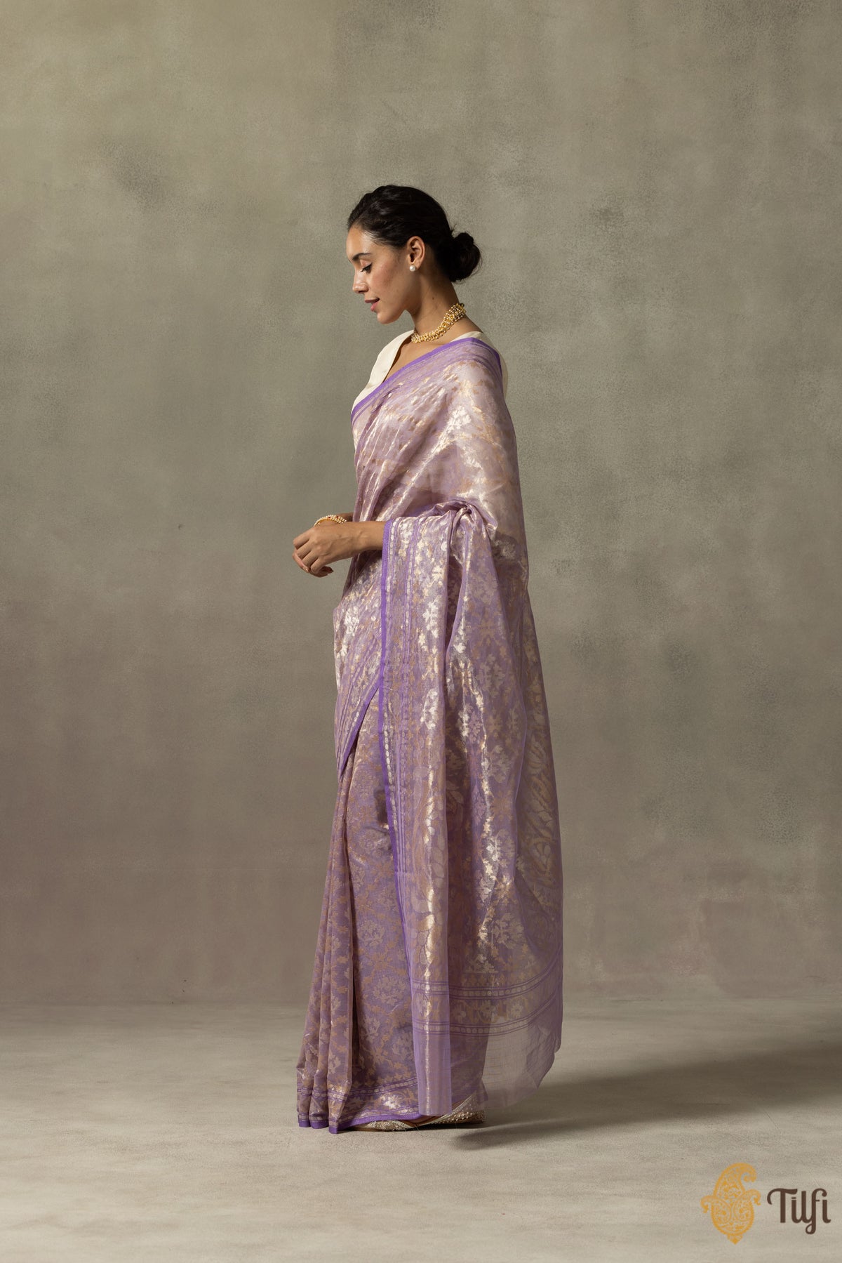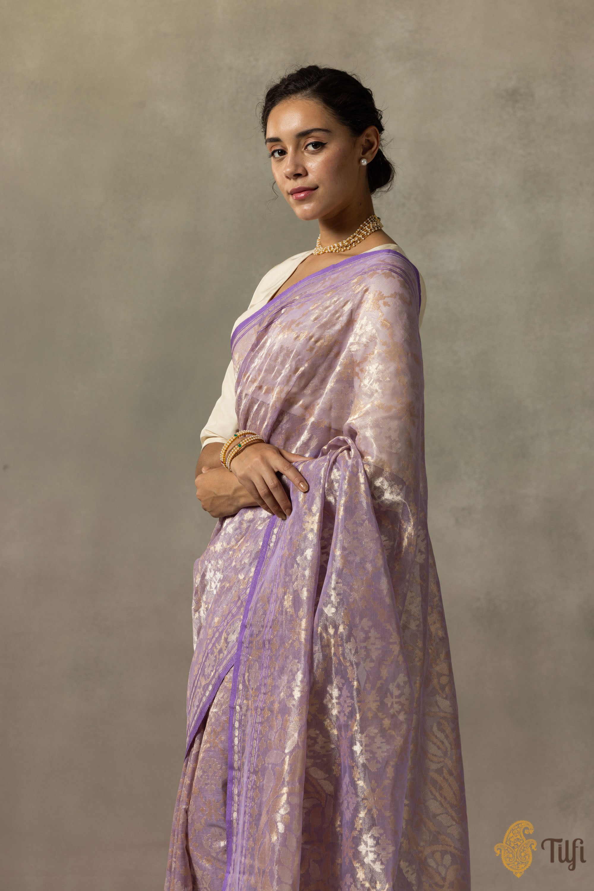 Speciality - With zari threads made of real silver, this is a Banarasi gem. Fine shimmering tissue, deftly woven with light as air Jamdani patterning, makes this a weave of extraordinary distinction. A magnificent jaali in roopa sona zari adorns the body with an elaborate, artistic pattern. This is a rare saree, made especially for the discerning.