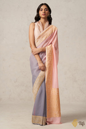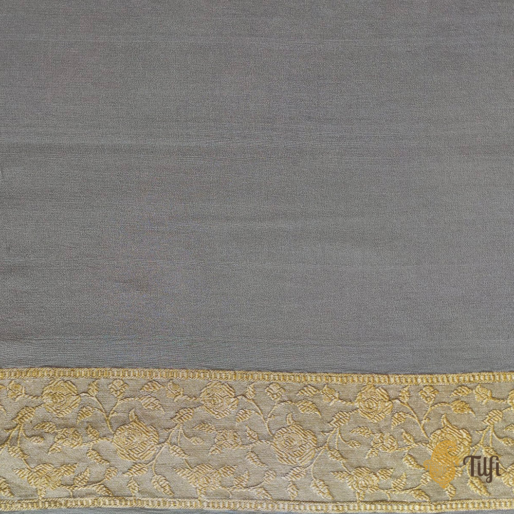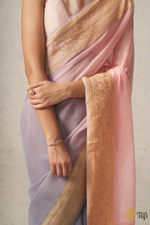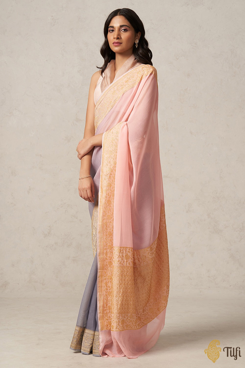A beautiful plain body Georgette silk saree hand-dyed to create a graceful light peach-grey ombré. Finished with intricate rose vines rendered in classic gold zari weaves on the borders.