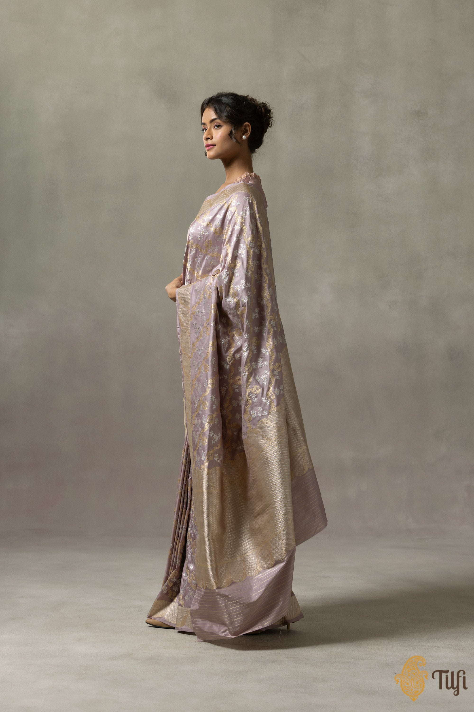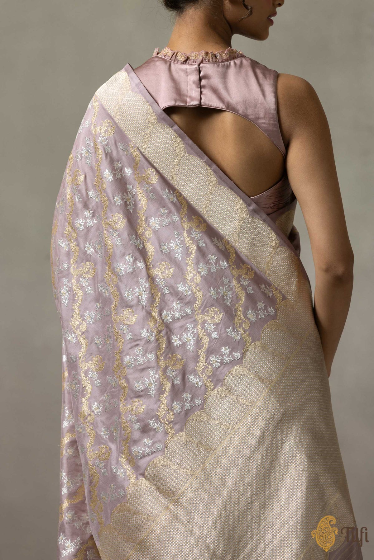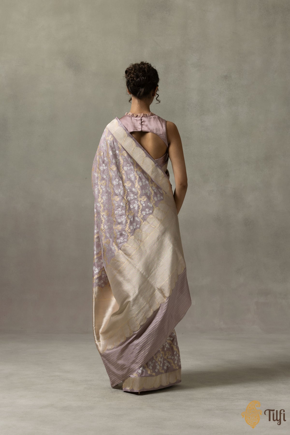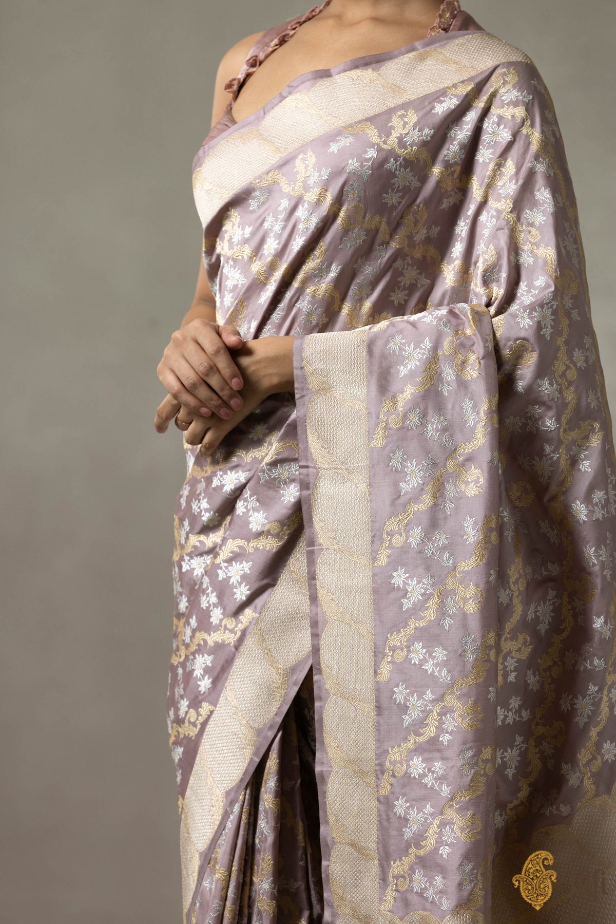 A lustrous drape adorned with a melodic aadha jangla rendered in roopa sona zari. The design extensively incorporates the acanthus motif, a hallmark of Rococo architecture. Complemented by a textured, scallop-shaped border inspired by Rococo embroideries.