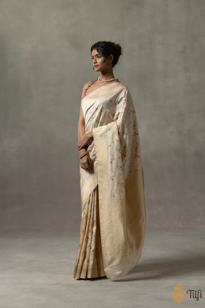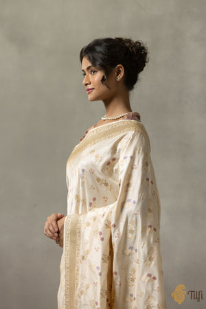 A pastel drape adorned with dainty Meenakari floral bootis in a light-hearted jangla pattern, recalling the soft palettes and playful art of Rococo. Edged with intricate, small floral zari vines along the borders and finished with a rich dose of zari on the pallu.