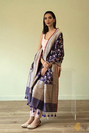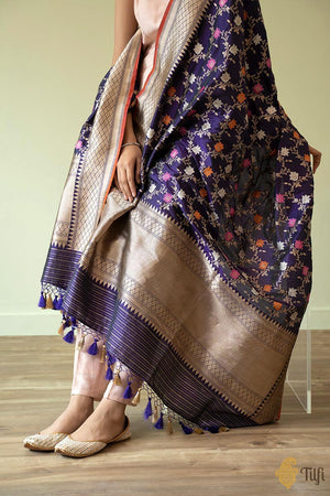 Nothing speaks to the splendour and opulence of Banarasi handloom better than this luxurious Odhni! A ravishing kadhua jaal, exquisitely crafted in gold and silver zari with accents of meenakari on a breathtaking silken bed.