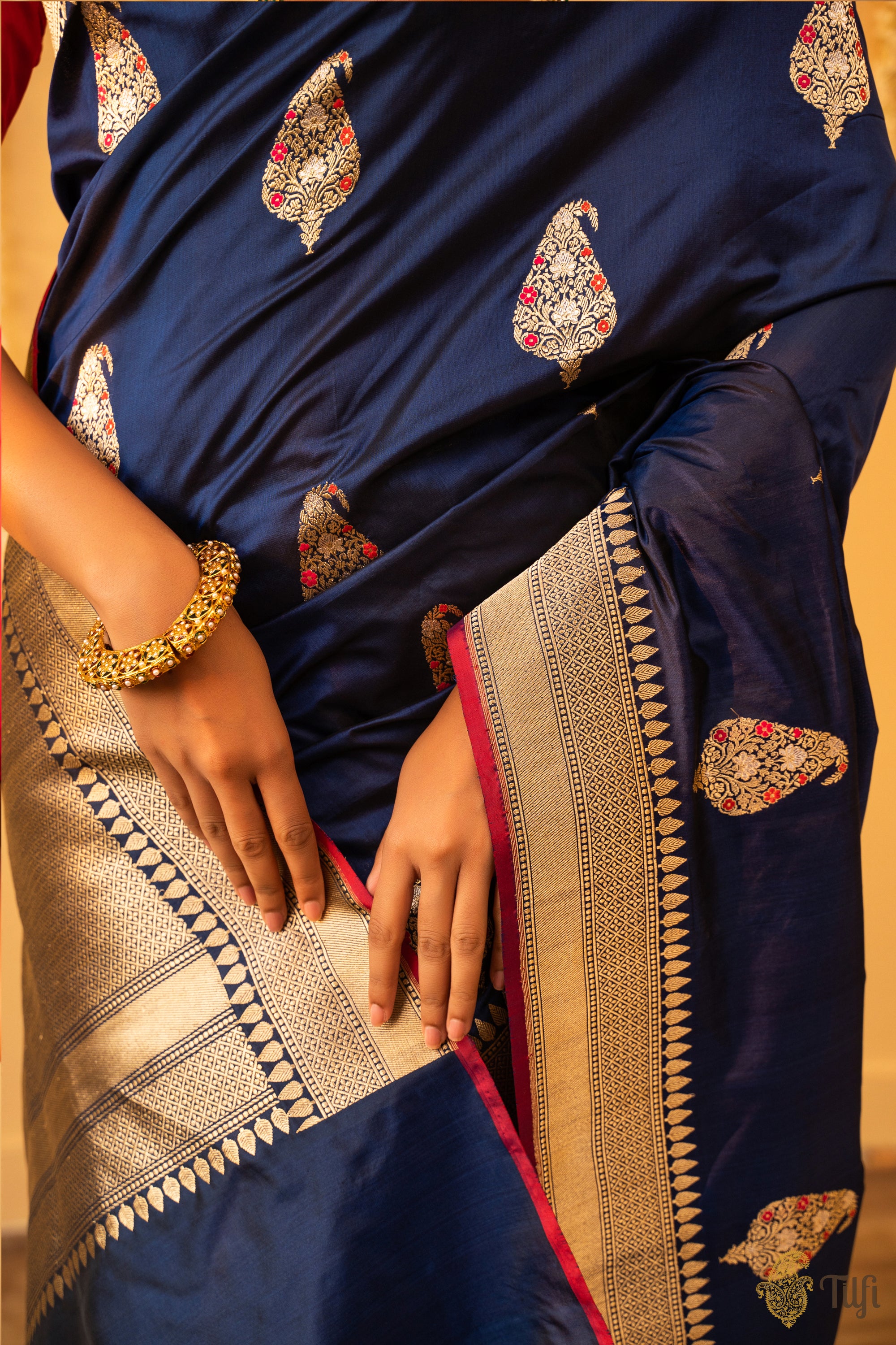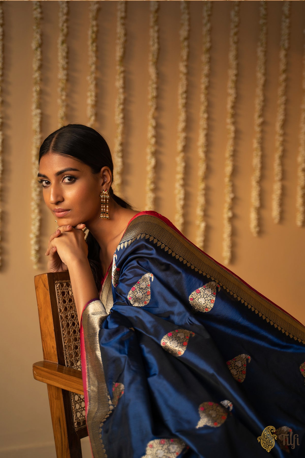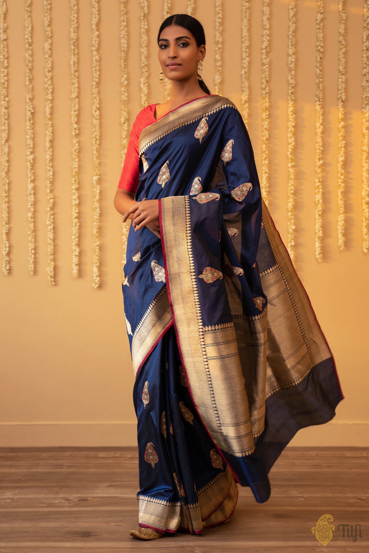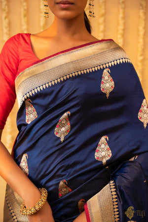 A regal colour and a heritage paisley motif with delicate meenakari accents! Exquisite, individually woven kadhua bootas on a beautiful resplendent bed of silk - this saree is a charming piece of handloom heritage, with love from Banaras.