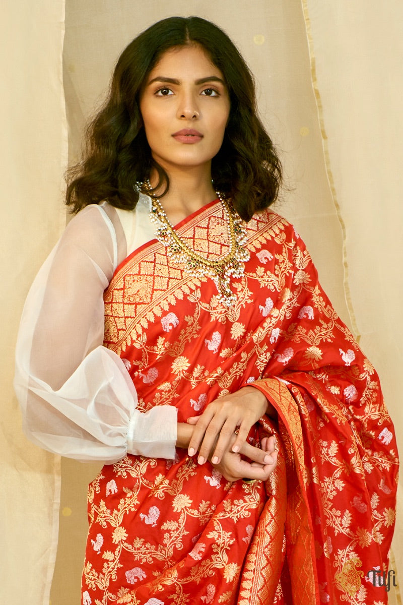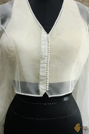Whimsical and absolutely fun! This a beautiful and dainty blouse in pure organza with delicate balloon sleeves and a pure raw silk inner. A chic pattern and a delicate line of fabric buttons makes for a feminine and fabulous saree accent.