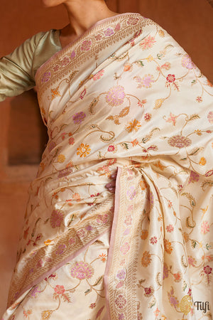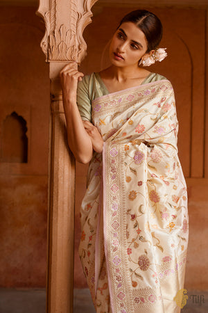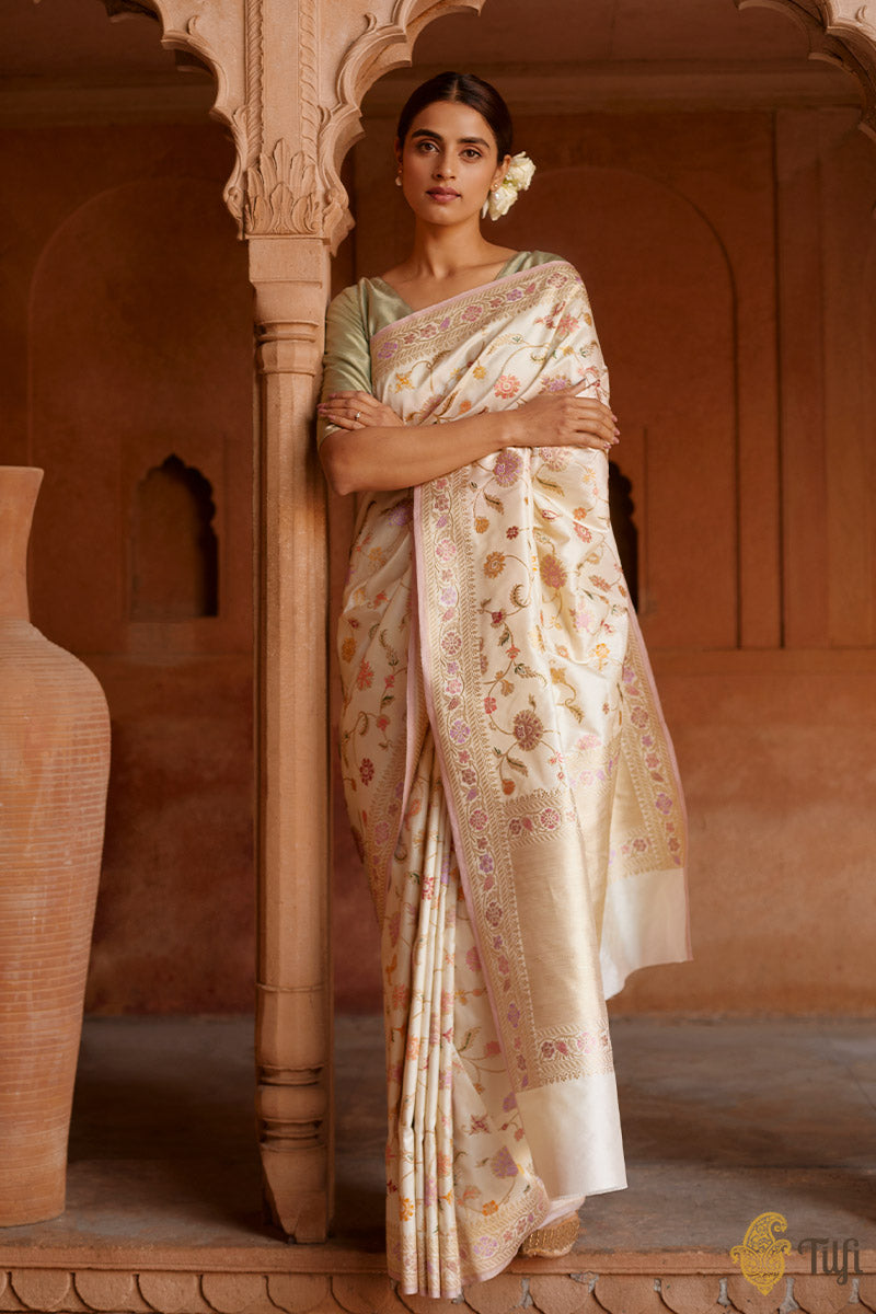 Speciality - A handwoven masterpiece with breathtaking Banarasi subtlety! Featuring an elegant zari floral jangla with meenakari accents.