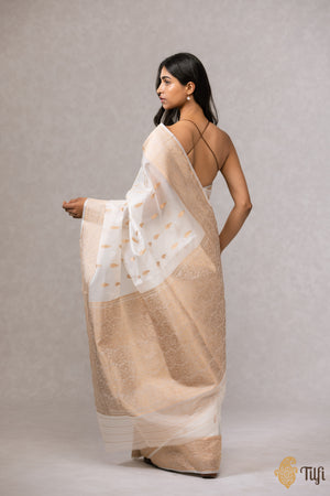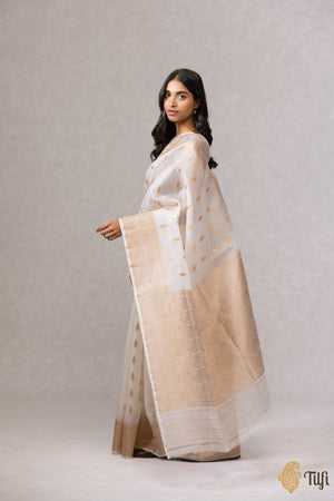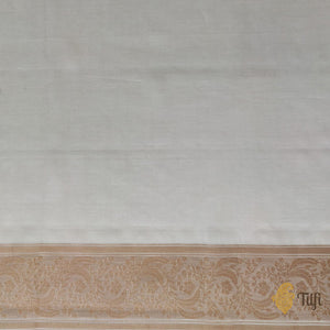 A captivating Banarasi Kora silk saree, handwoven as a reminder of a bygone era. Adorned with a minutely detailed pattern with vintage inspirations and rendered in antique zari for wistful recollections of the past.