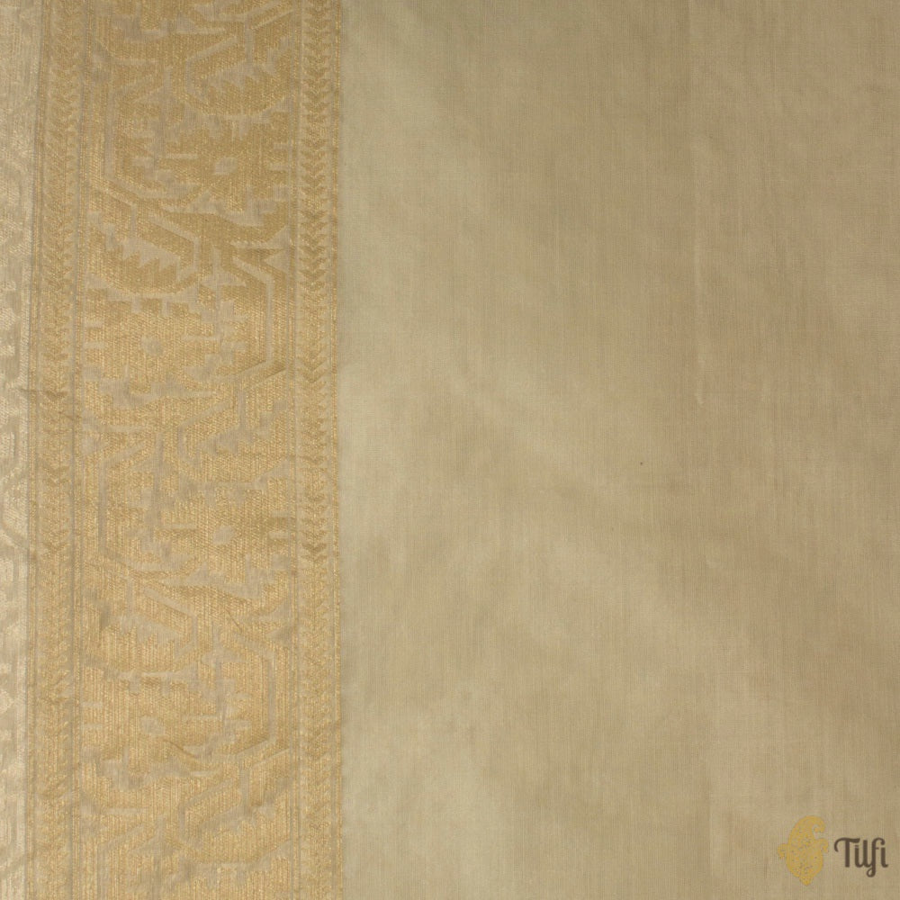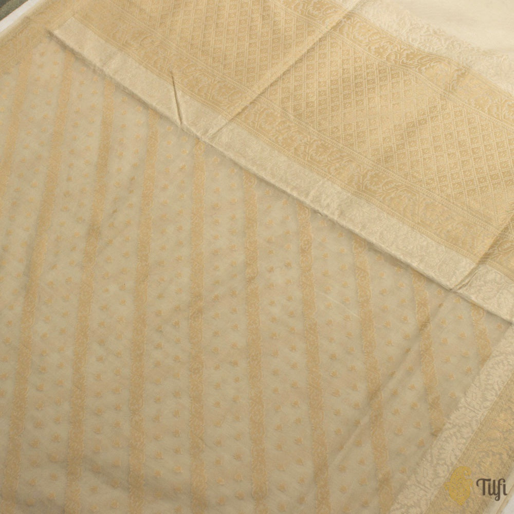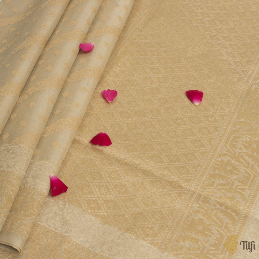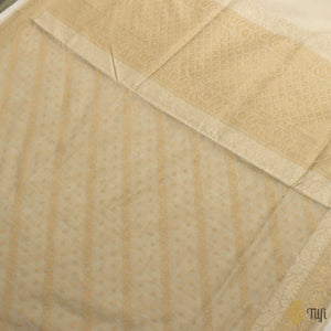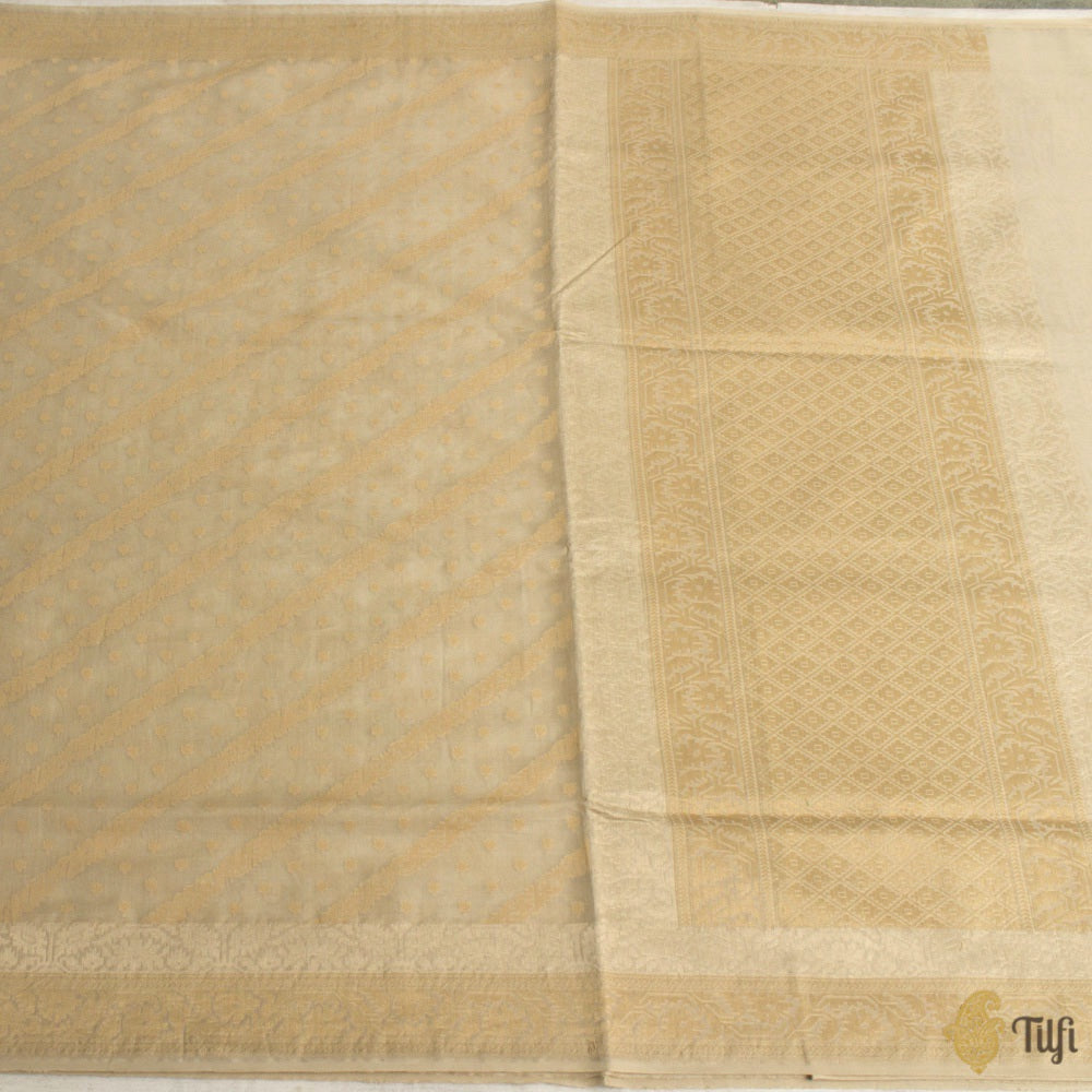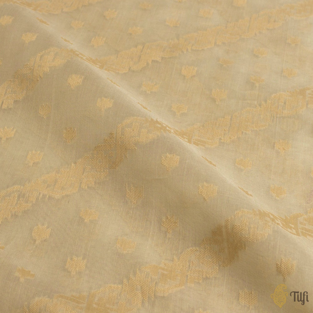 An ethereal handloom classic with myriad design inspirations! A lovely, light Tilfi Banarasi kora silk by cotton saree with resham aadha jaal and a distinctive roopa sona Jamdani style border. For days when nothing can weigh you down.