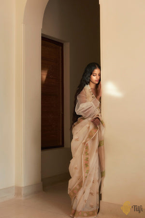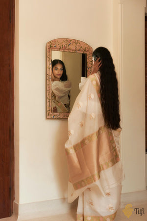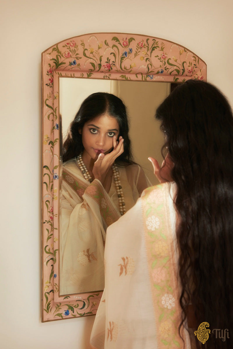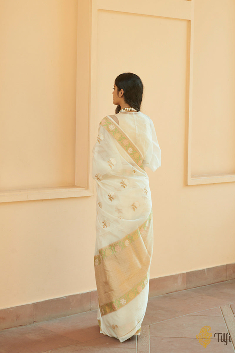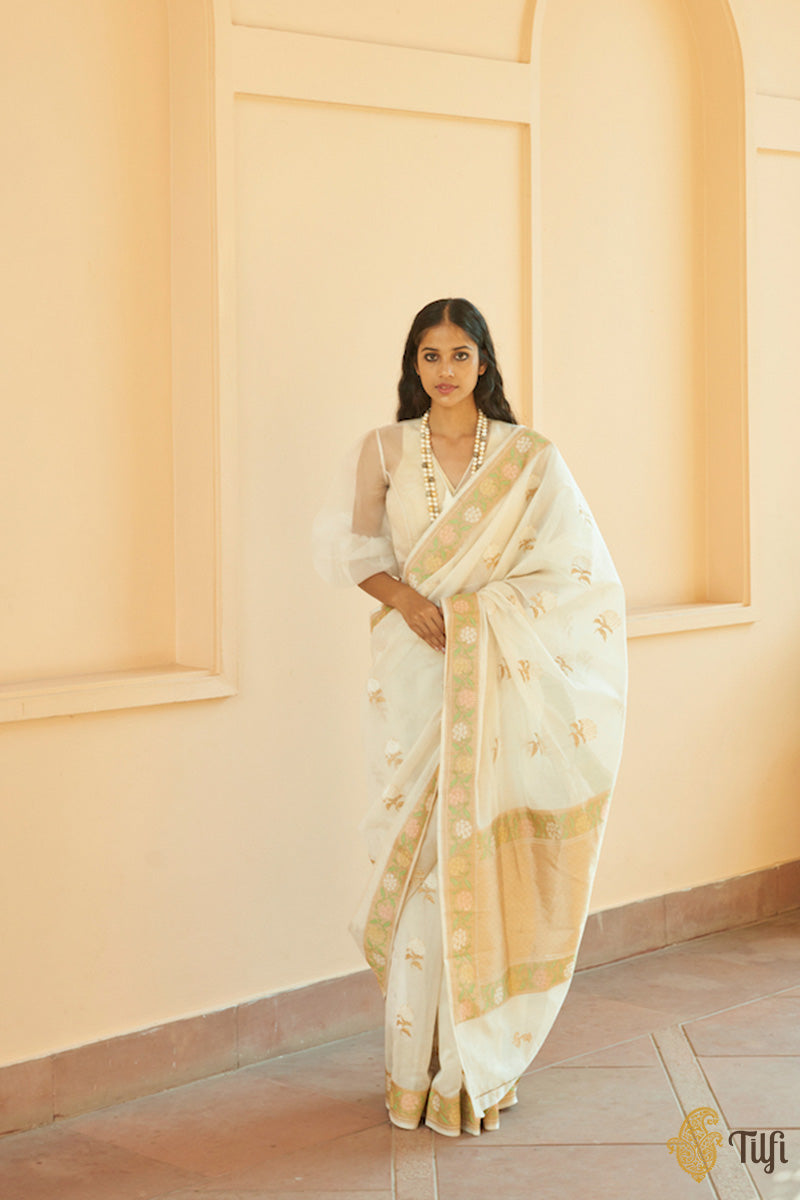 An enchanting, diaphanous drape, adorned with kadhua Hydrangea floral motifs in Roopa Sona zari. The beautiful and intricately detailed bootas on the body are delicately balanced by pastels meenakari florals on a bed of gold zari.