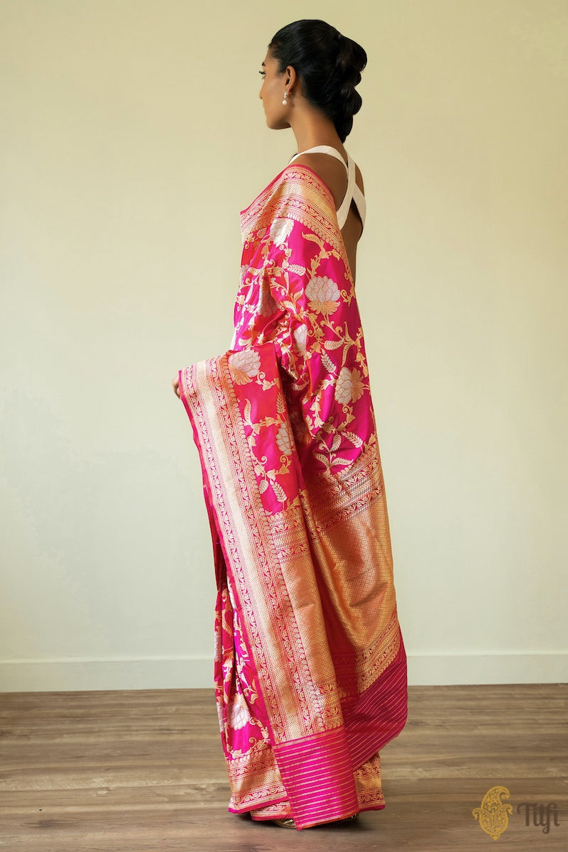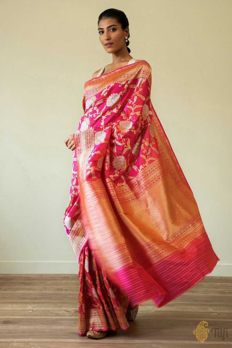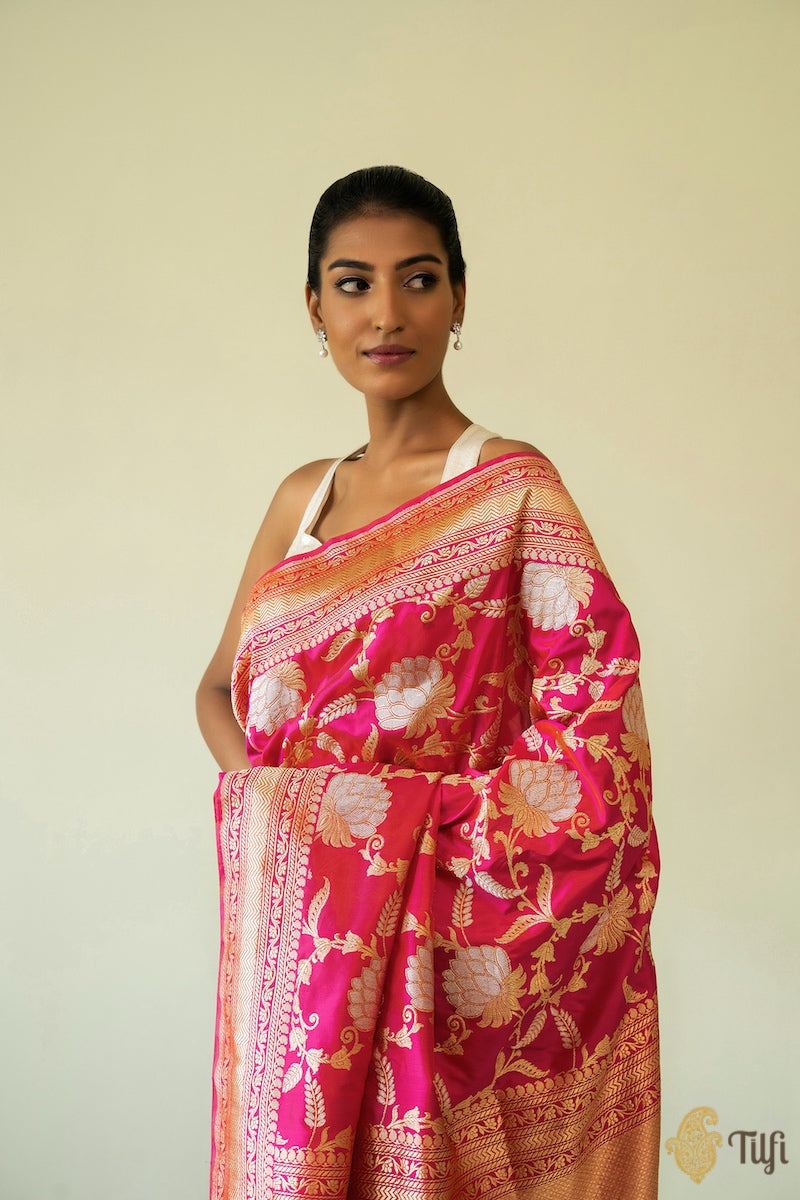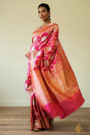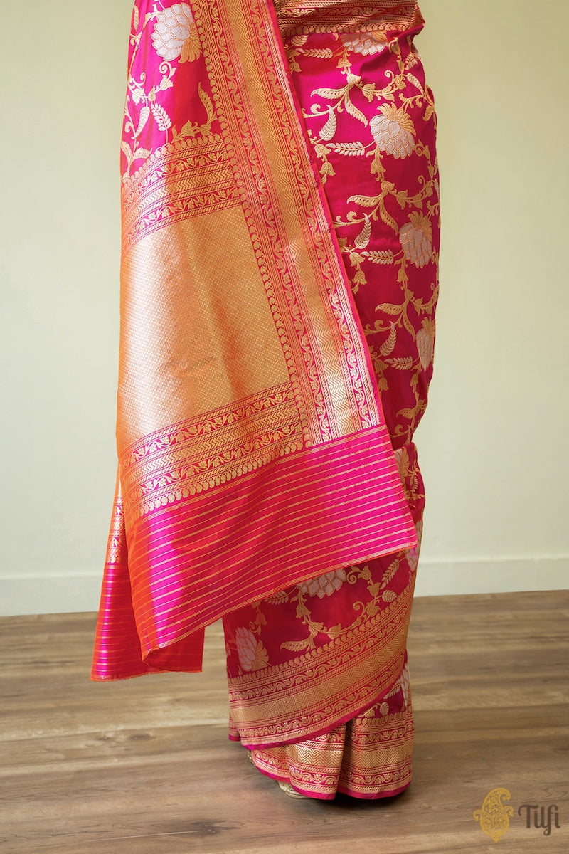 Speciality - Luxury is in the details of this handwoven masterpiece with a rich and intricate Roopa Sona or Gold and Silver zari floral jangla. Breathtaking Banarasi opulence!