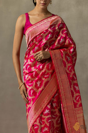 A vibrant handloom saree in an exquisite Shikaargah design, featuring an opulent web of zari, figures, and animal motifs crafted in roopa sona zari.