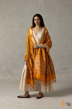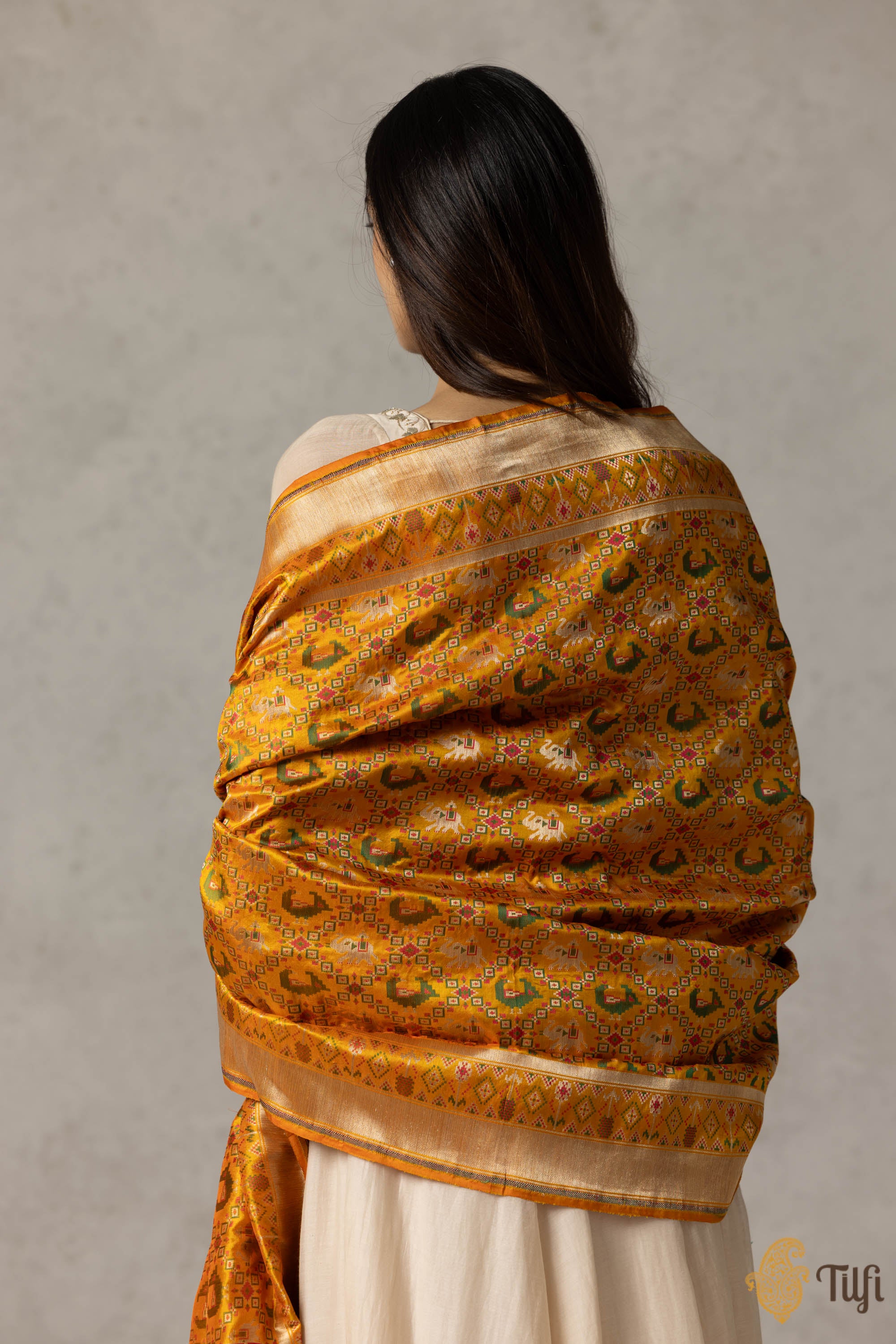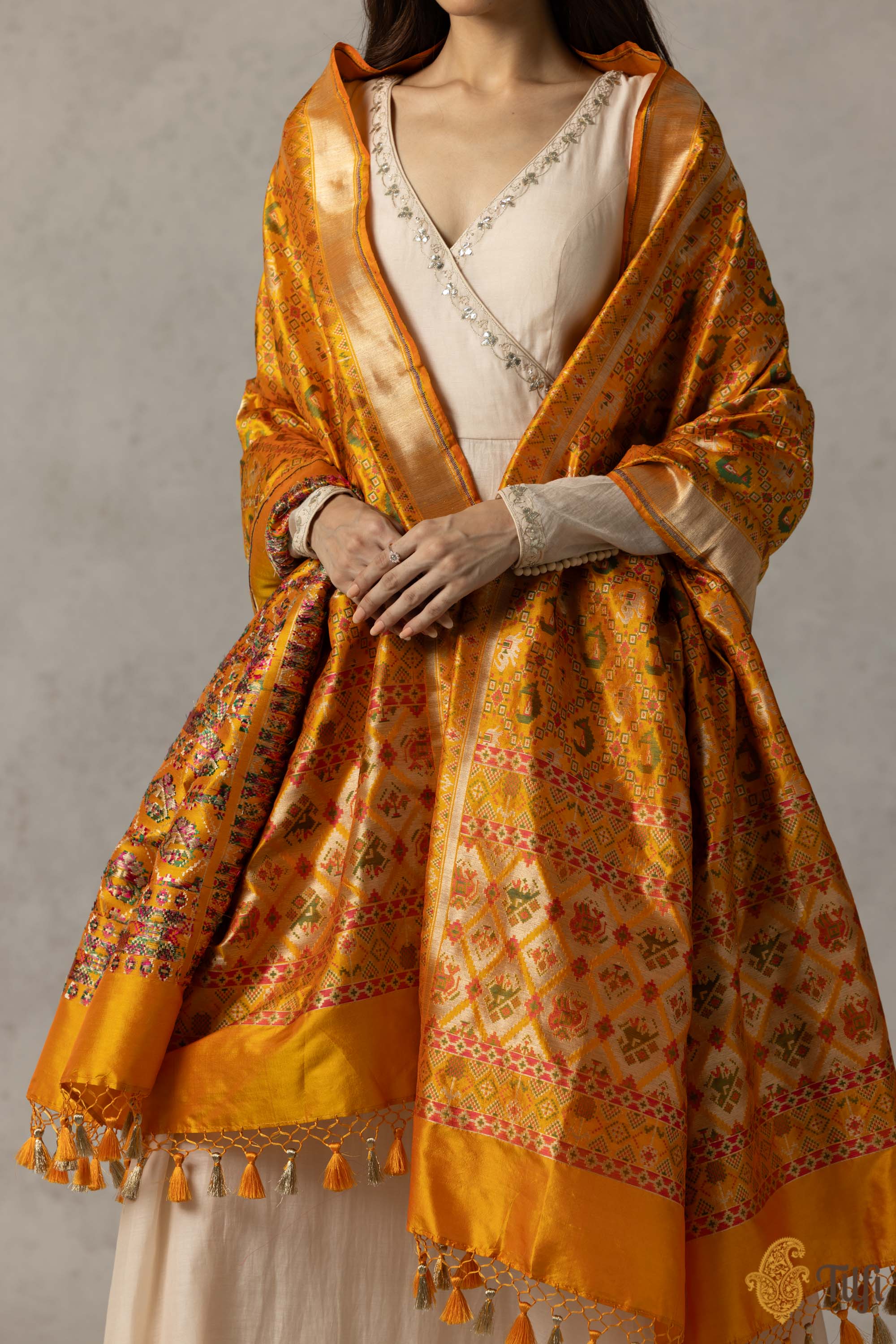 An example of Banarasi ingenuity. The handloom Banarasi Patola dupatta is a classic dedicated to the rich weaving tradition of Patan, Gujarat. A celebration of Indian textile arts.