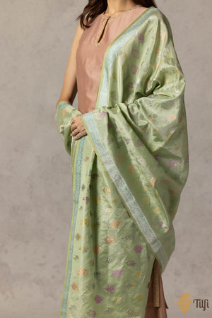An heirloom odhani of extraordinary craftsmanship. Featuring an exquisite shower of florals and botanicals in Kadhua Meenakari on a shimmering bed of Katan Silk Tissue.