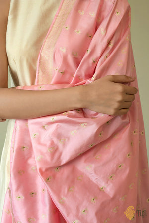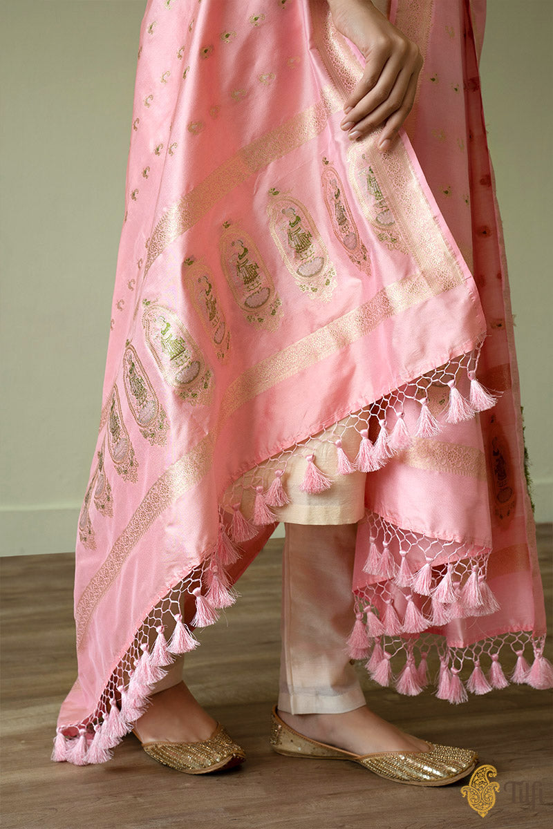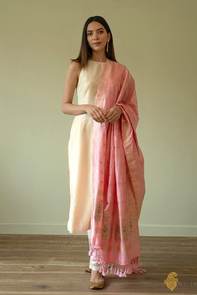 Reminiscent of a bygone era, this handwoven dupatta is fit for queens. Pair it with a kurta in dull gold for an elegant ensemble or a contrasting colour for a more dramatic look. Resplendent silk and regal zari work, classic Banarasi!