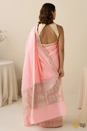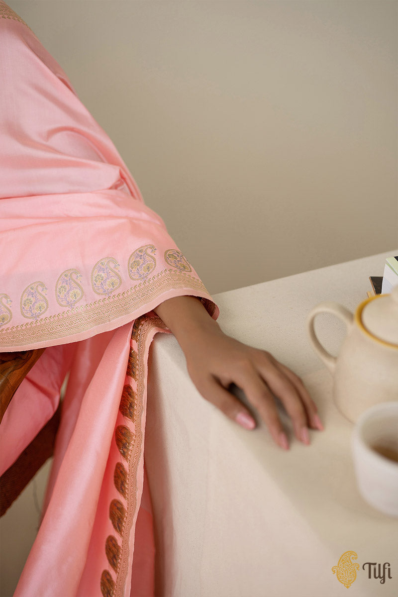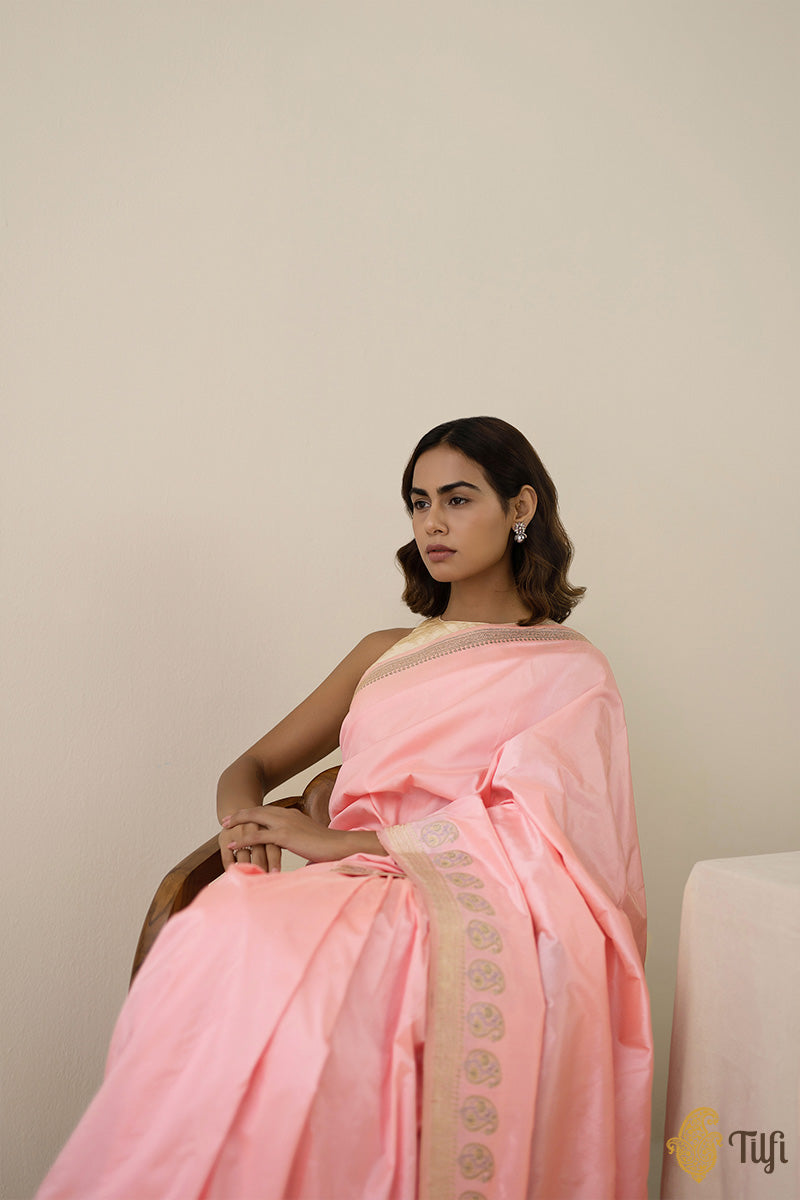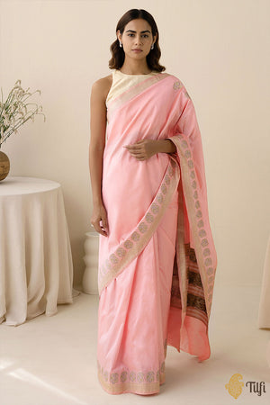 Exuding old-world charm, this is a timeless Banarasi masterwork. Recreated from a saree from our private collection, this is a lovingly handwoven katan silk classic with artistic kadhua weave paisley bootas along its border. Who wouldn't be captivated?