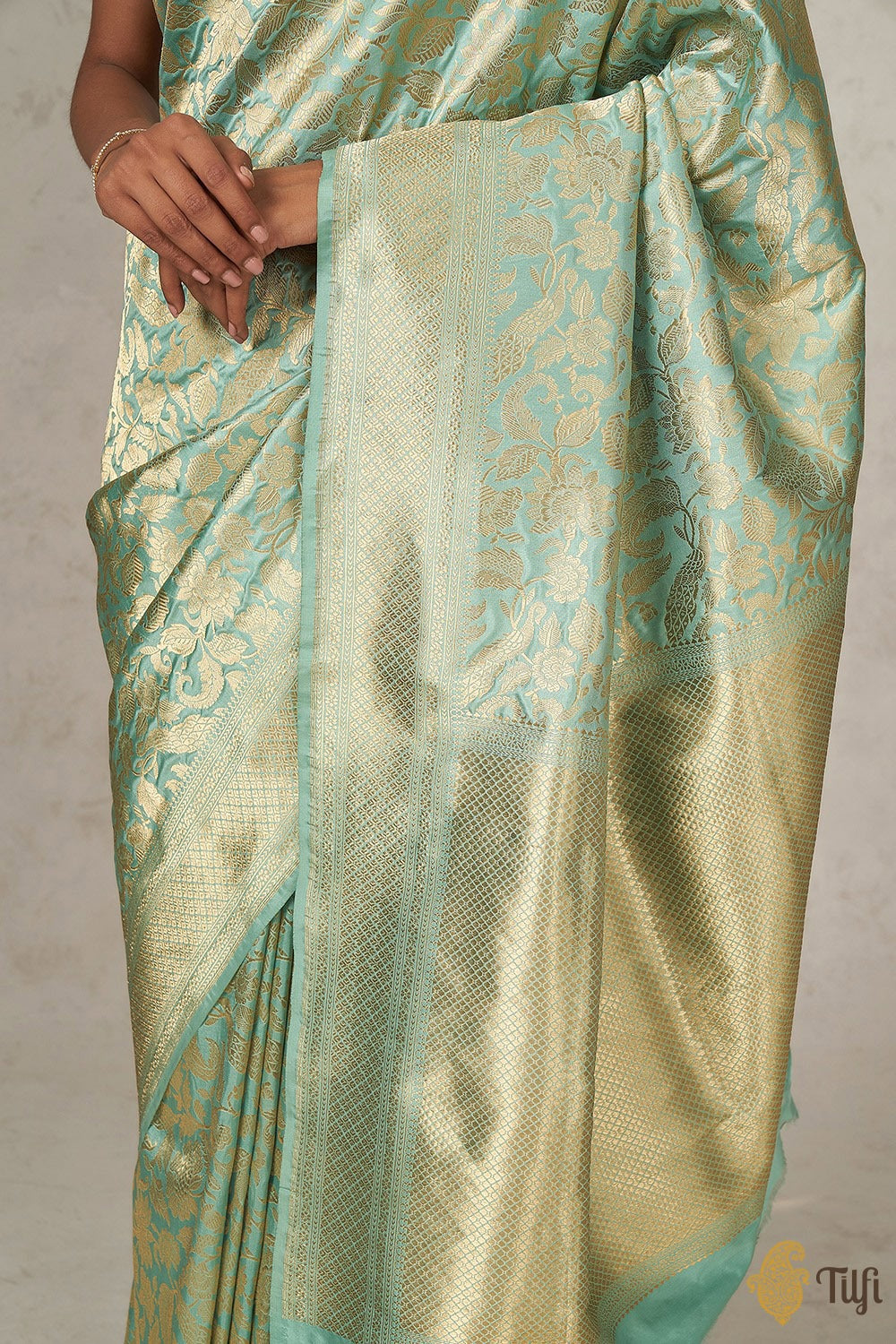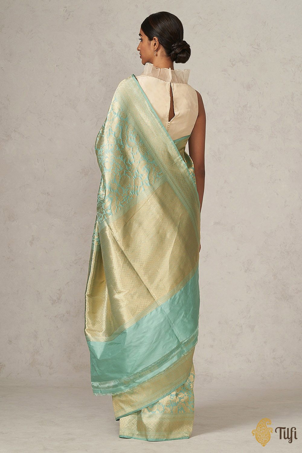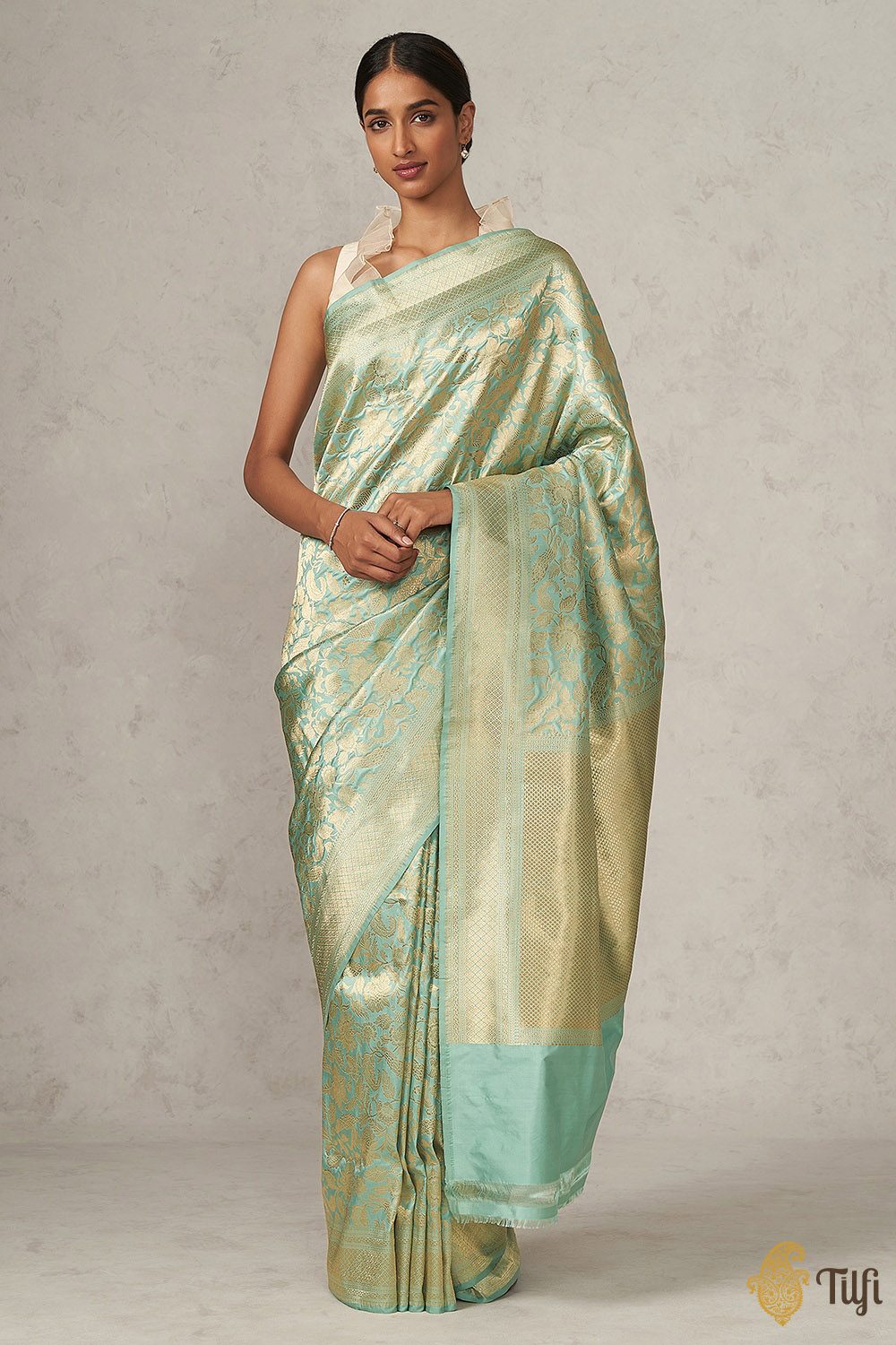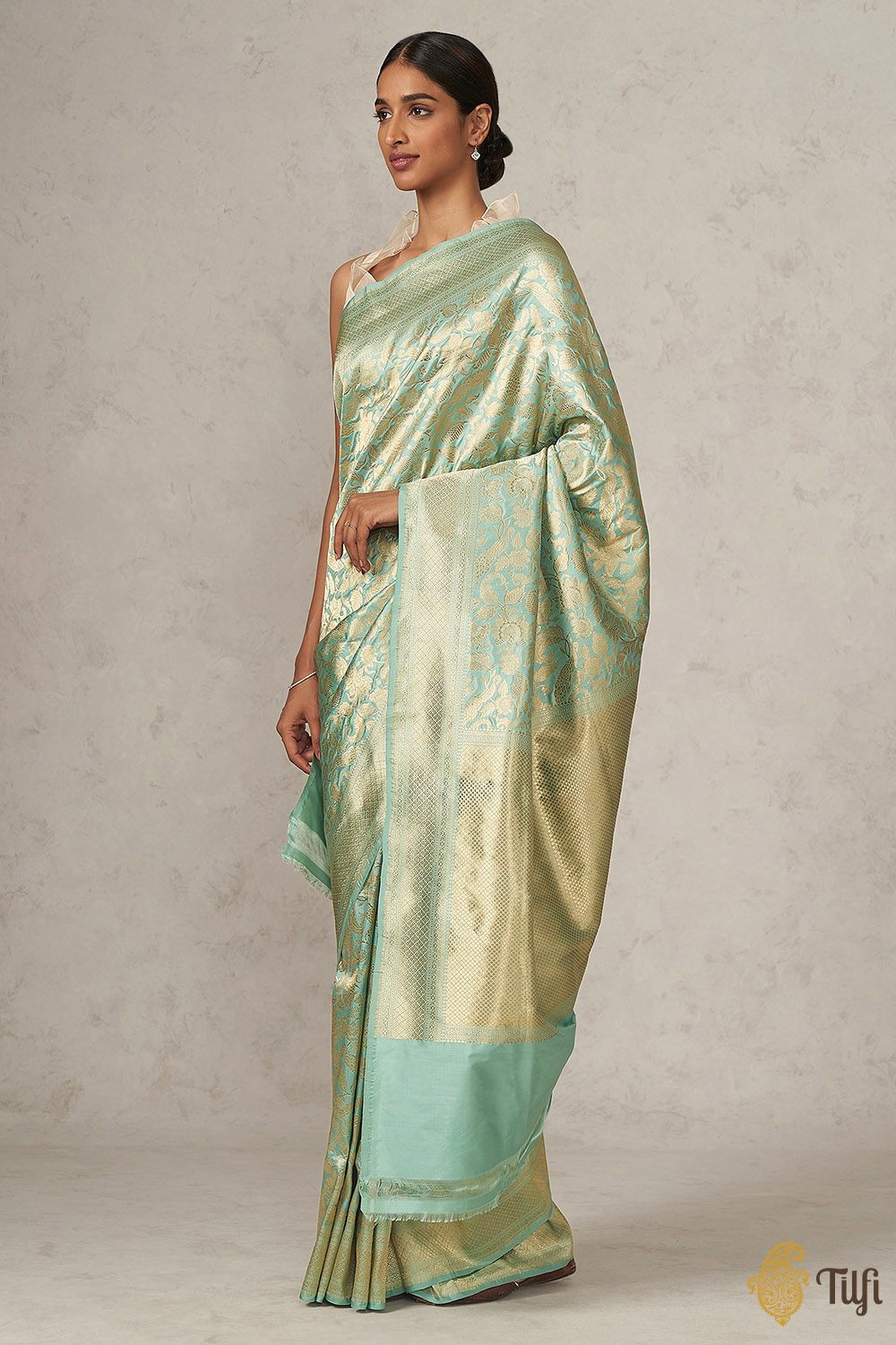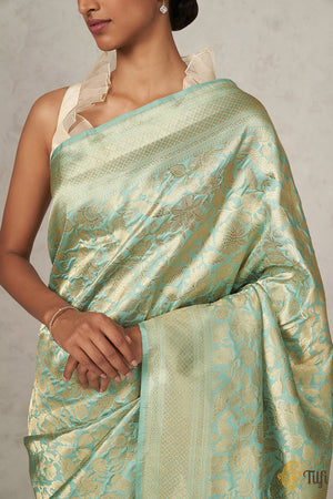 With its rich floral web of zari, this regal saree showcases refined Banarasi handloom art on a soft, pure Katan silk drape.