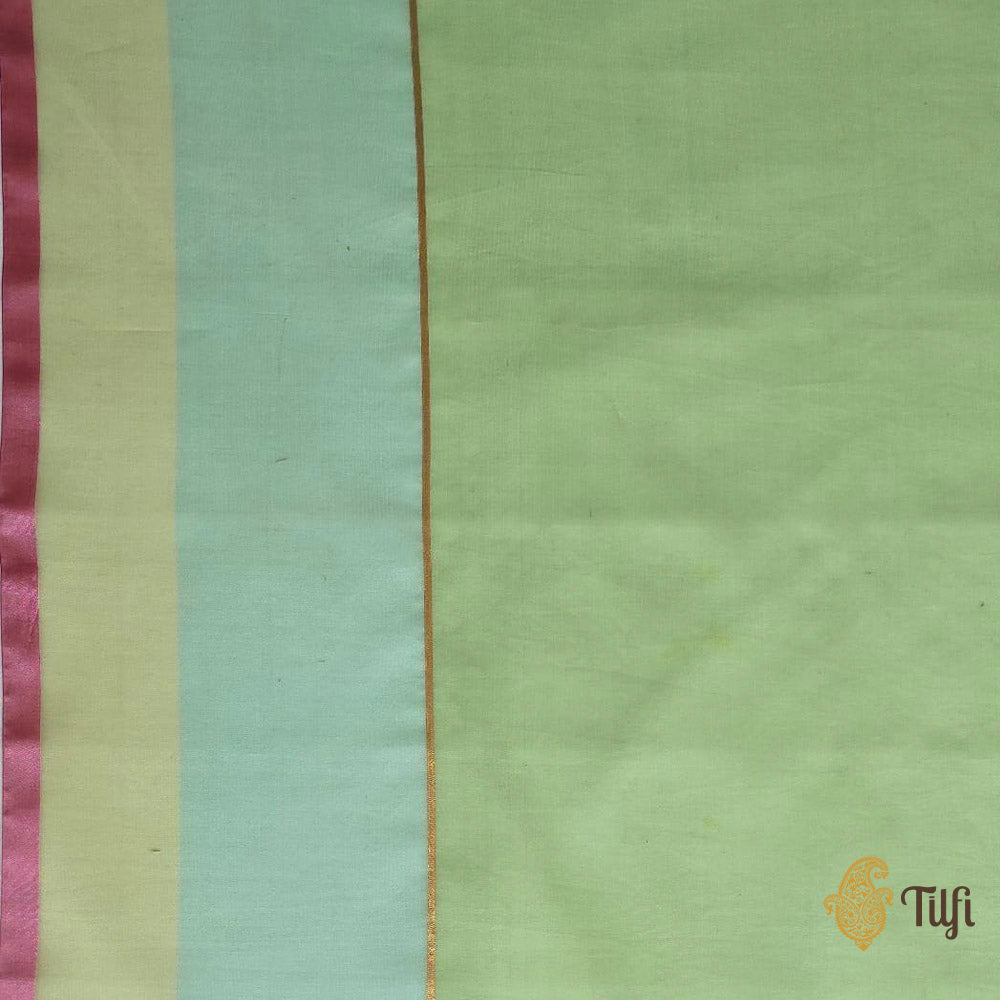 Speciality - This ethereal saree is a vibrant combination of pastel hues, woven in pure Kora silk. Its diaphanous body is subtly accented with singular zari lines, adorned with a striking colour-blocked border and completed by a beautiful zari pallu.