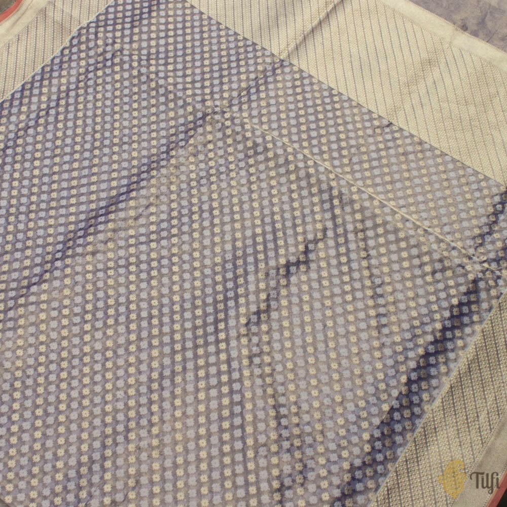 A picture of perfection. This is a gorgeous and lustrous saree for days when nothing can dull your sparkle! It has beautiful gold zari and resham bootis, all on a gossamer bed of Kora Tissue. Delicate and dreamy Banarasi!