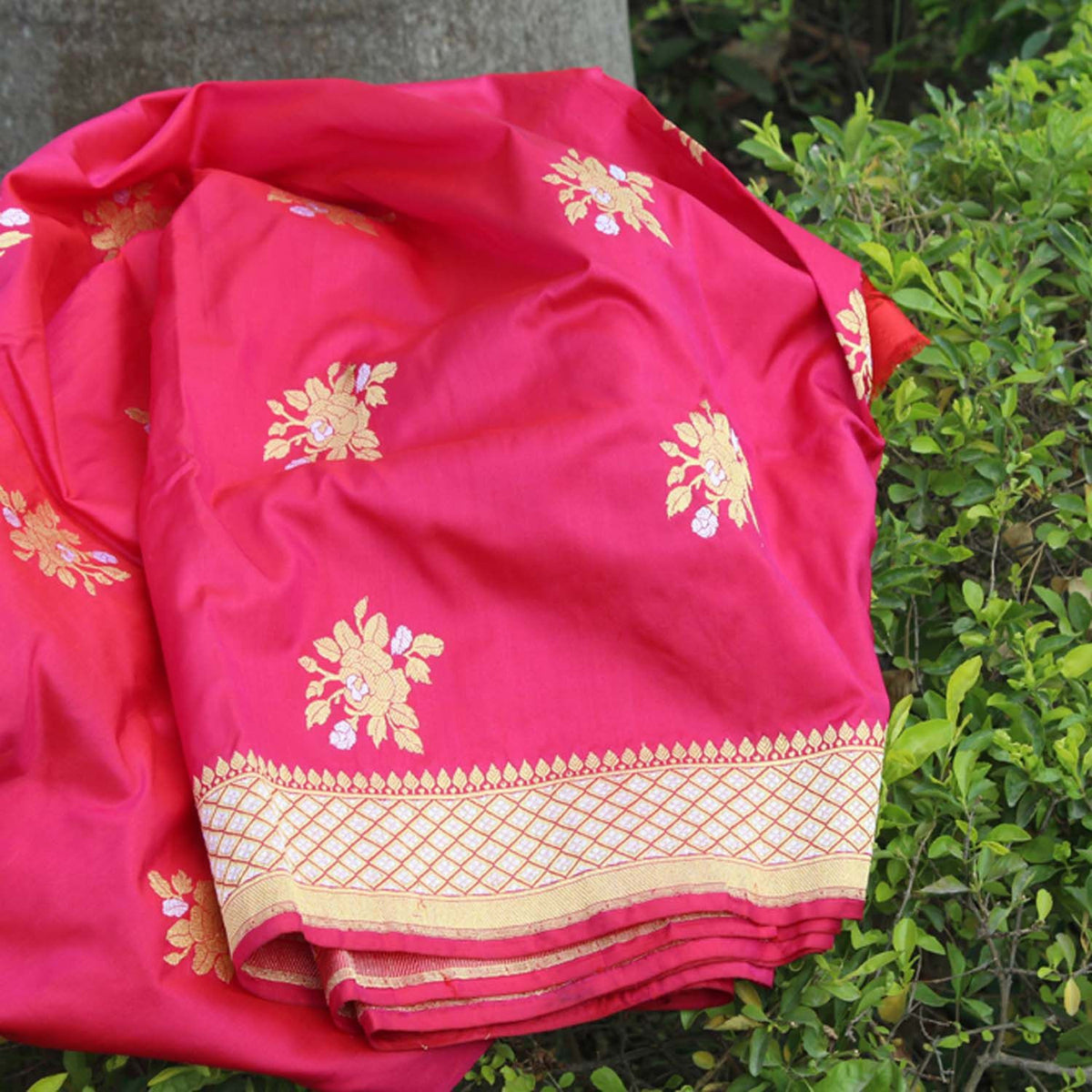 Only the hands of a master craftsmen can recreate the splendour of a blooming rose on silk. This is an enchanting dupatta, lovingly handwoven in Banaras.