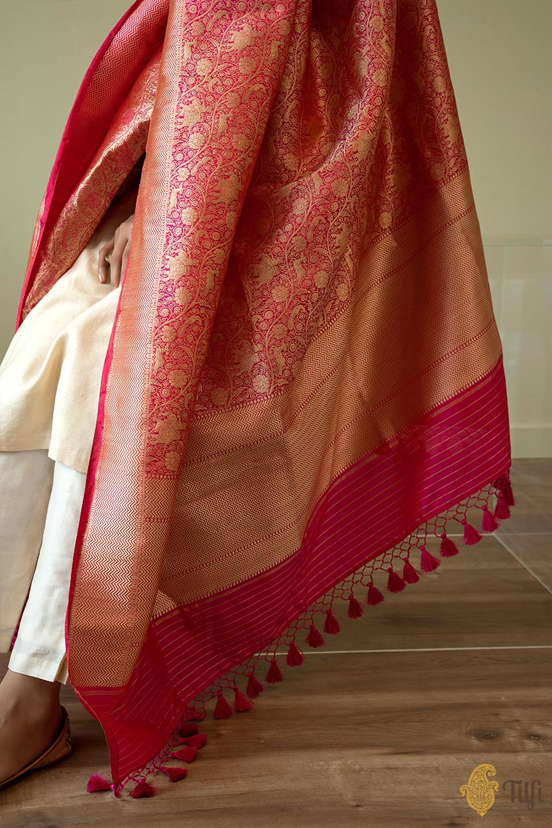 A rich and luxurious aadha Shikaargah dupatta made of resplendent Katan silk. Adorned with regal bird and animal motifs amid a landscape of vines rendered in refined gold zari work.