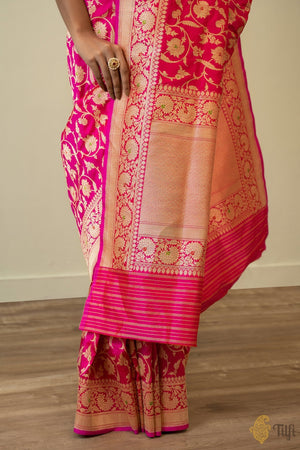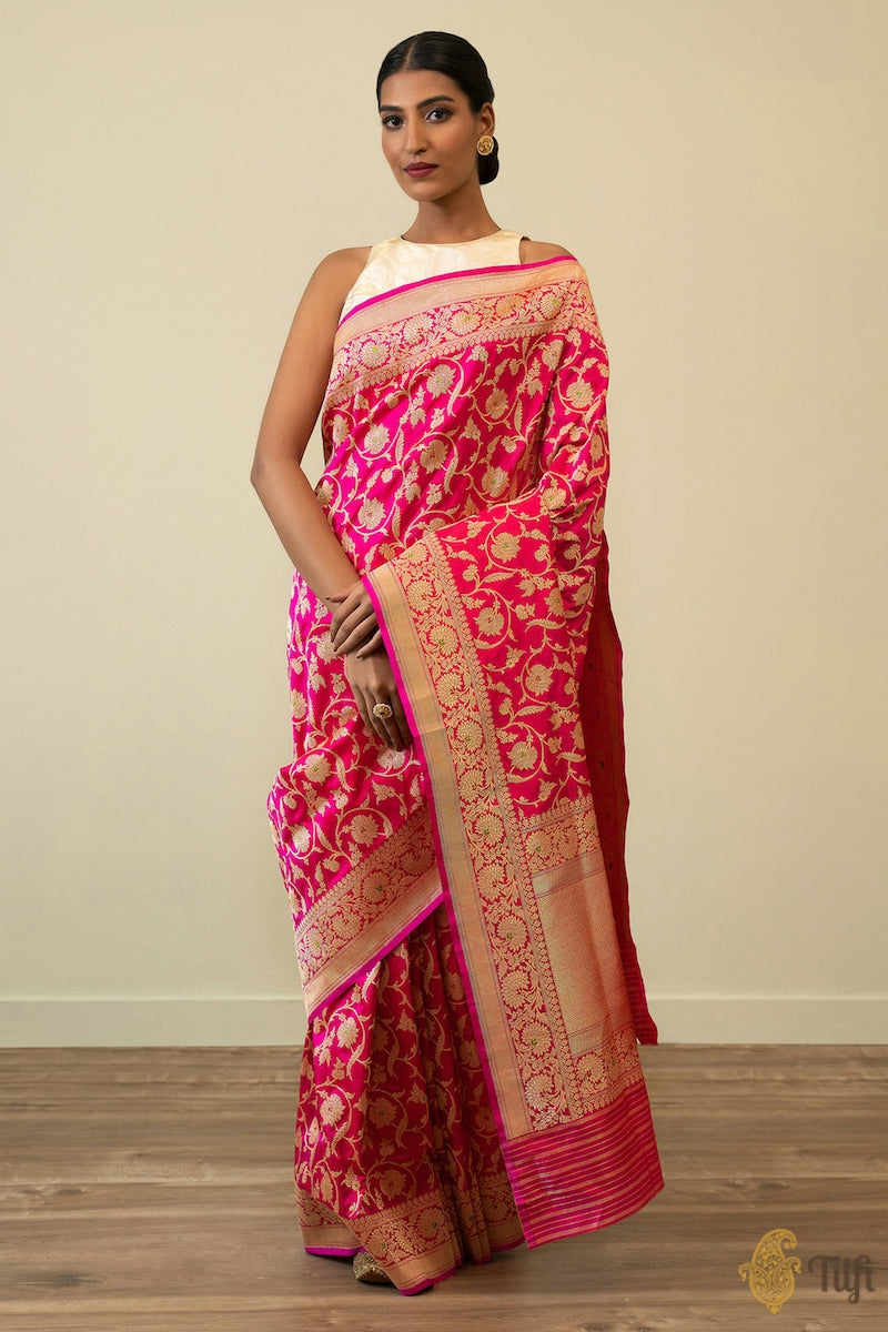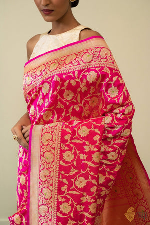 The saree everyone dreams of when they dream Banarasi! A quintessential Banarasi classic with a floral kadhua jangla pattern, handwoven in gold zari and subtle hints of Meenakari. Traditional, time-honoured silken art.