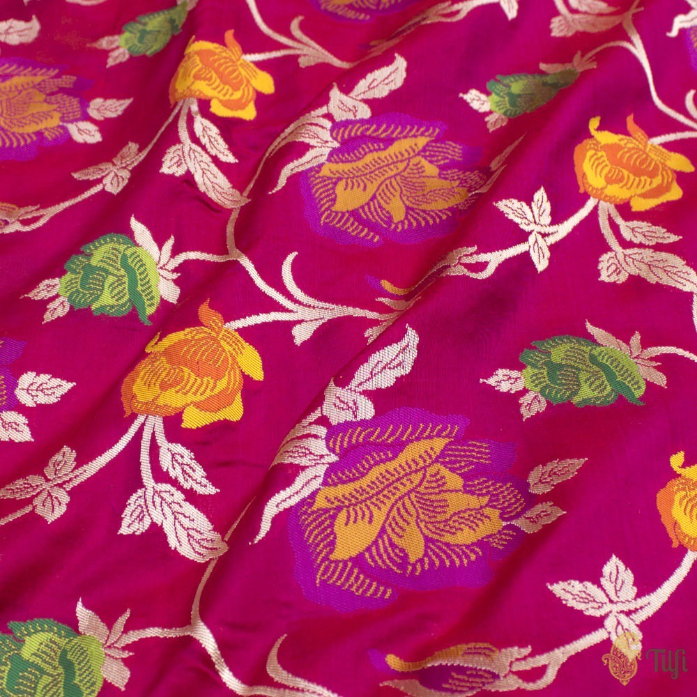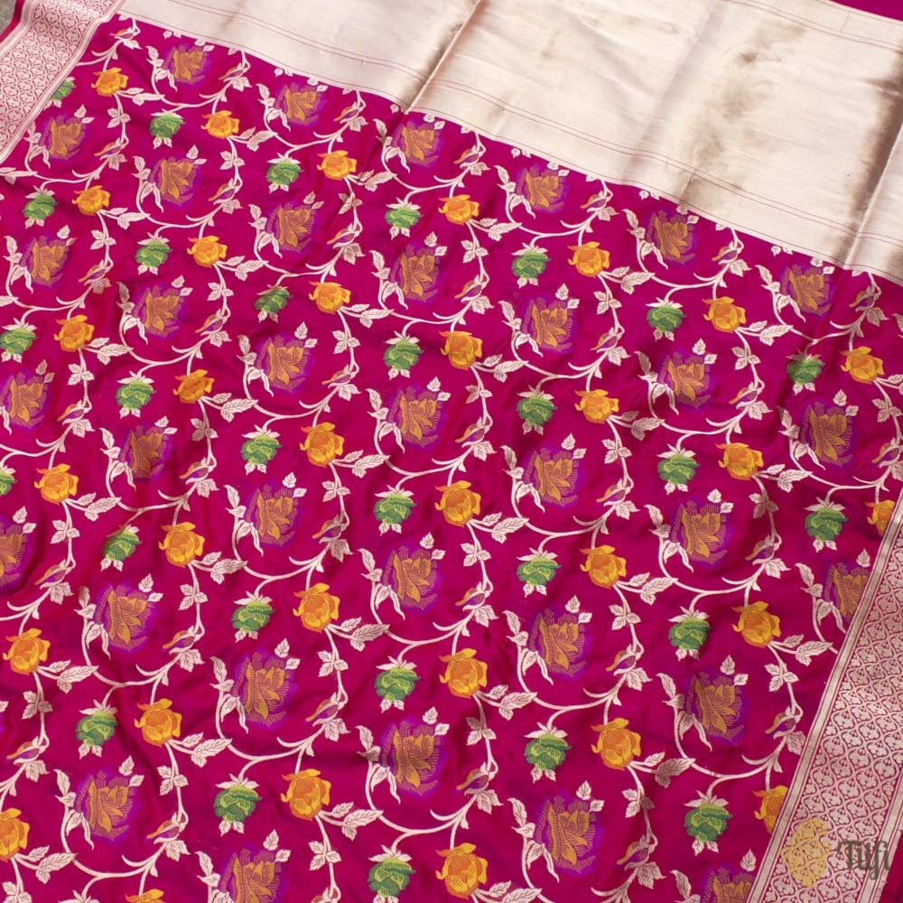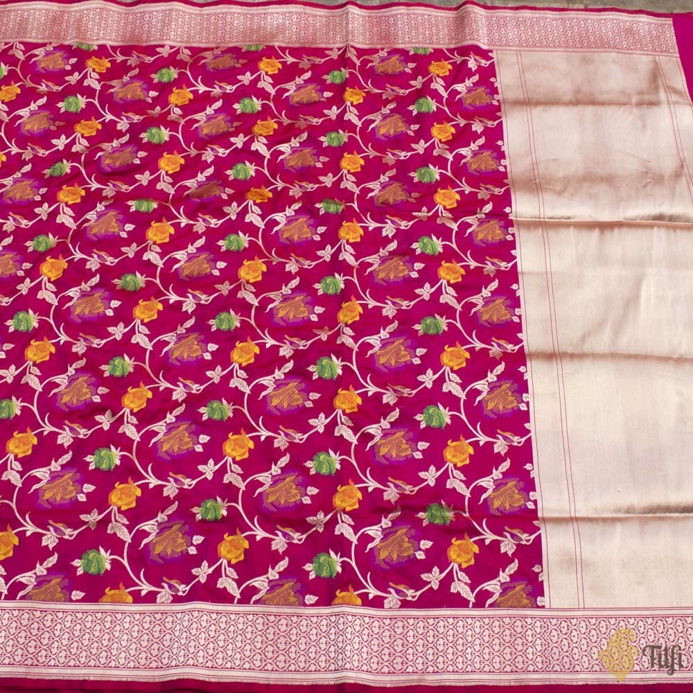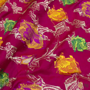Speciality - A beautifully handwoven allover floral jaal with multicoloured Meenakari, creating a veritable bouquet on the yards of cloth.