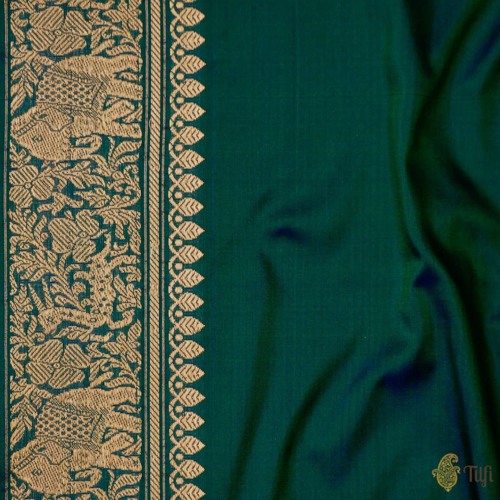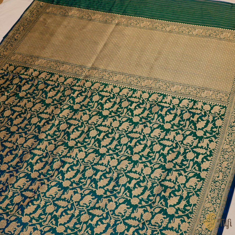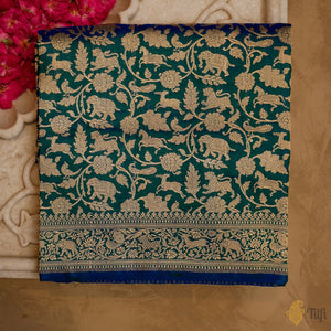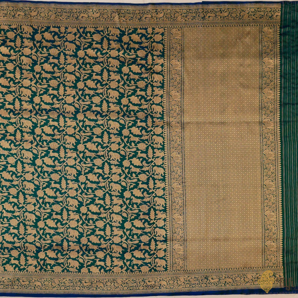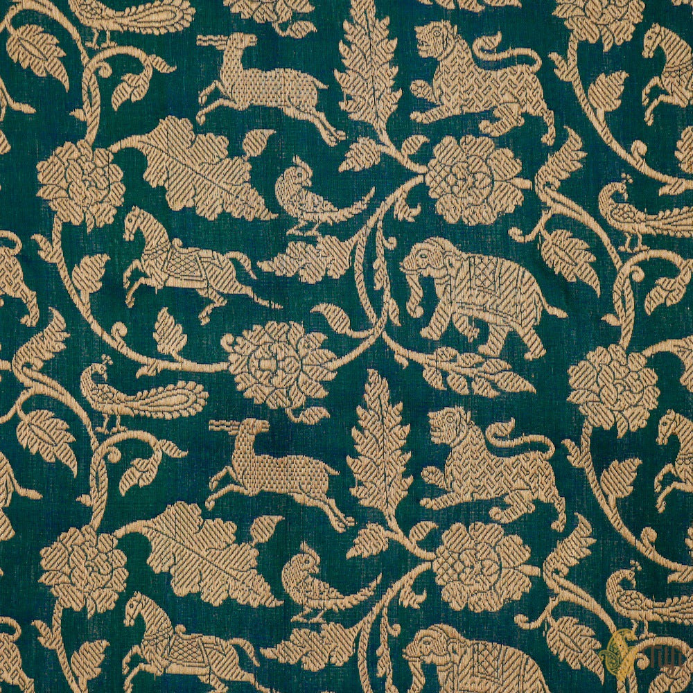 A rich and luxurious Shikaargah handloom saree. Zari vines, animal motifs and intricate jungle scenes make this a piece of woven art. An ode to handloom and a true Banarasi masterpiece.