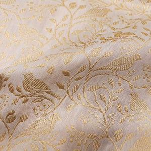 An entirely delightful and adorable thaan! With its little chirps and twitters coming through a web of gold zari vines - our "Kuhu" thaan is a Banarasi handloom classic, evocative of royal gardens and an ode to handloom traditions.