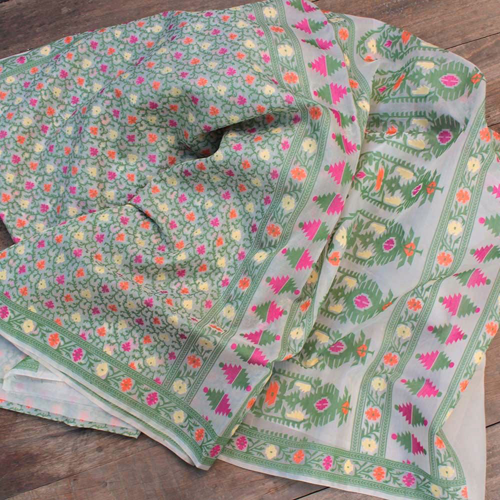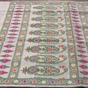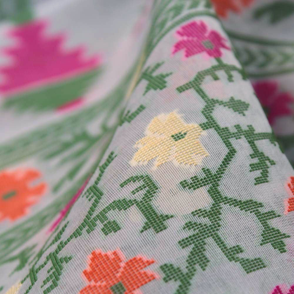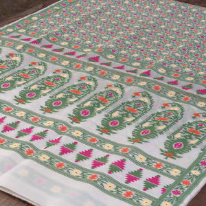 Speciality - A light, classy and timeless kora silk saree with an intricate cutwork jaal. The post-weaving process of cutting the leftover threads on the back of this saree itself takes a week!