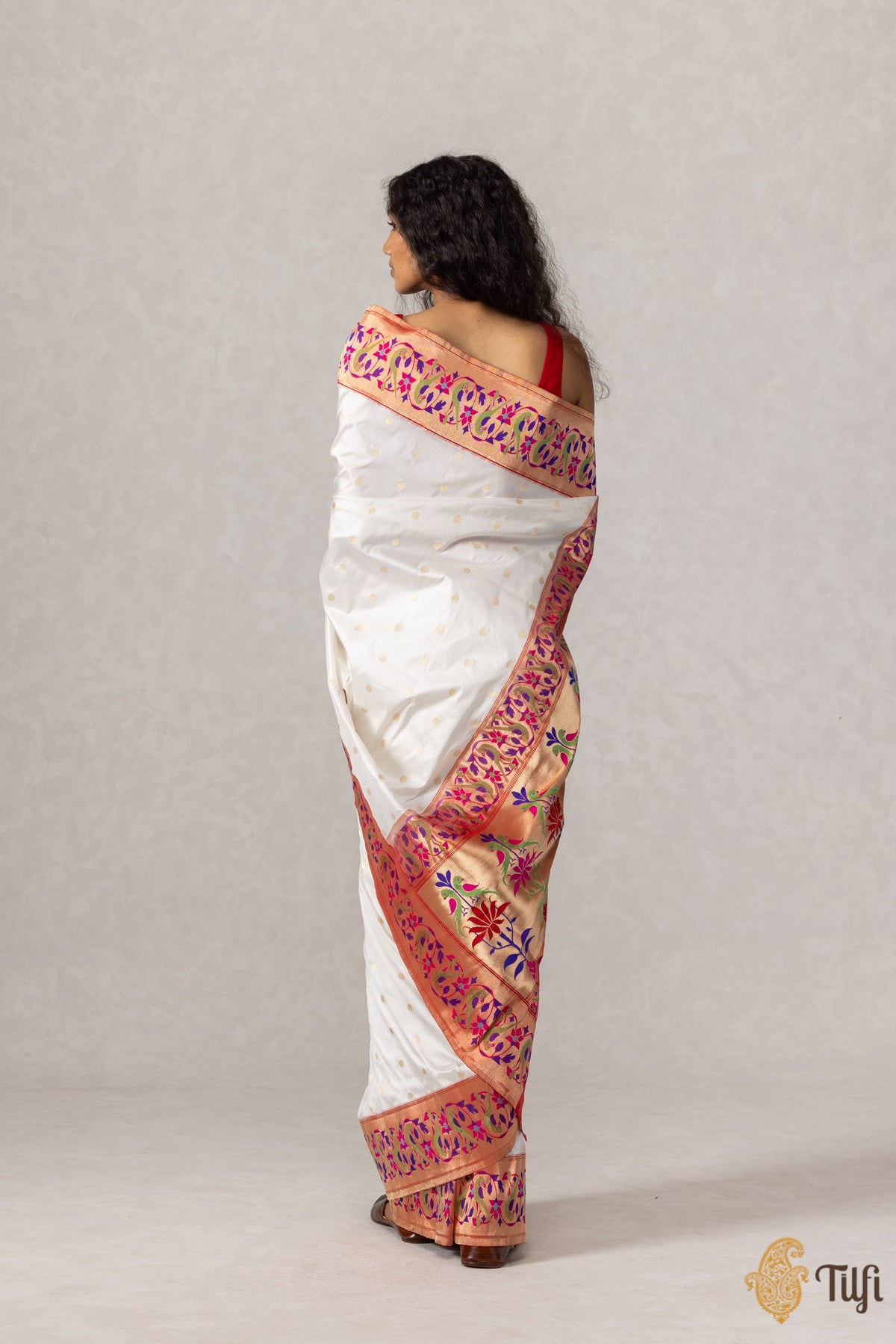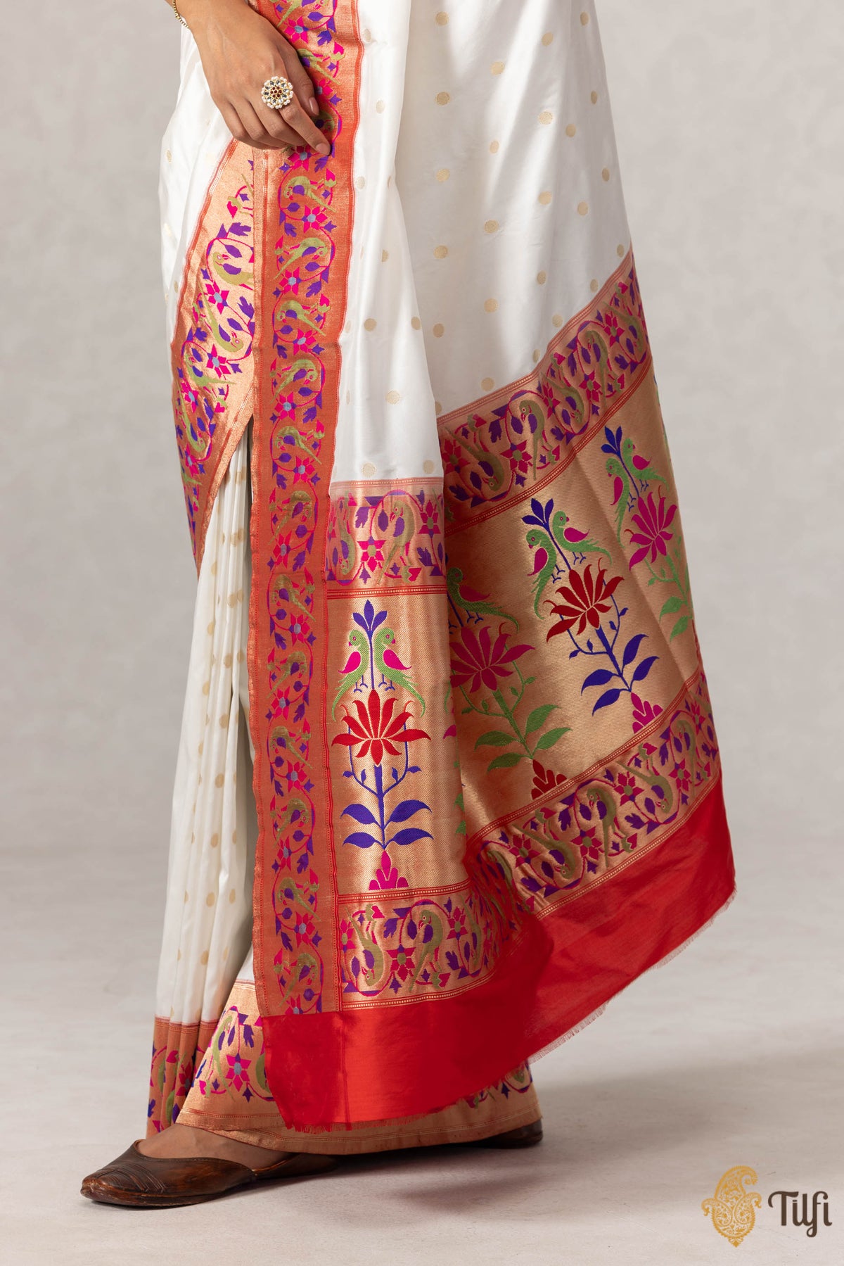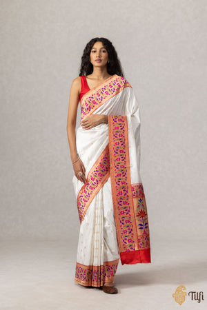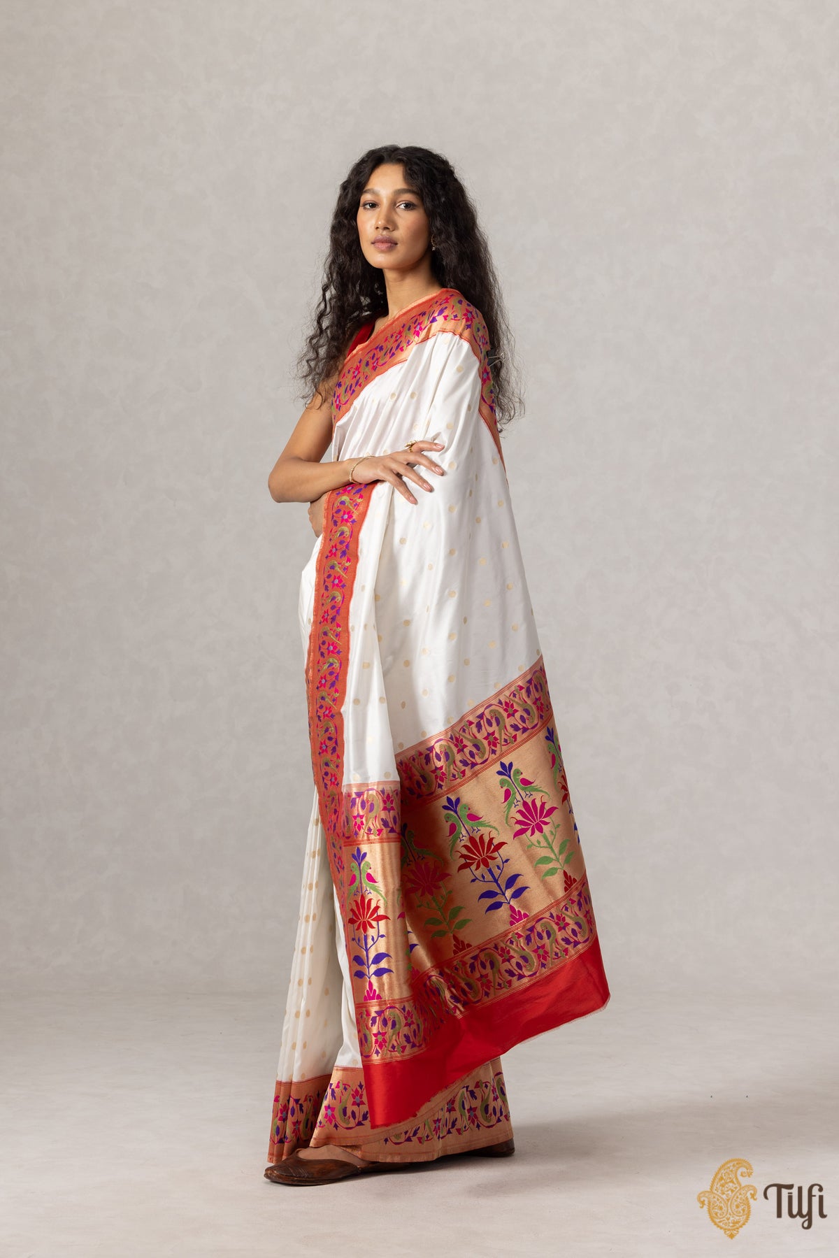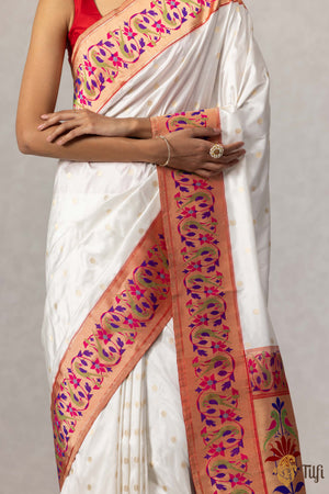 Technique - A classic handwoven Paithani; a technique that uses a zari warp to form a rich golden ground, adorned by beautiful Meenakari work, the painstaking addition of supplementary coloured threads during the hand-weaving process.