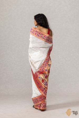 Historically donned by the royal families of Maharashtra, this Banarasi Paithani is the perfect saree for a rich, regal and distinctively traditional look! Asharfi bootis and beautiful parrots adorn this classic.